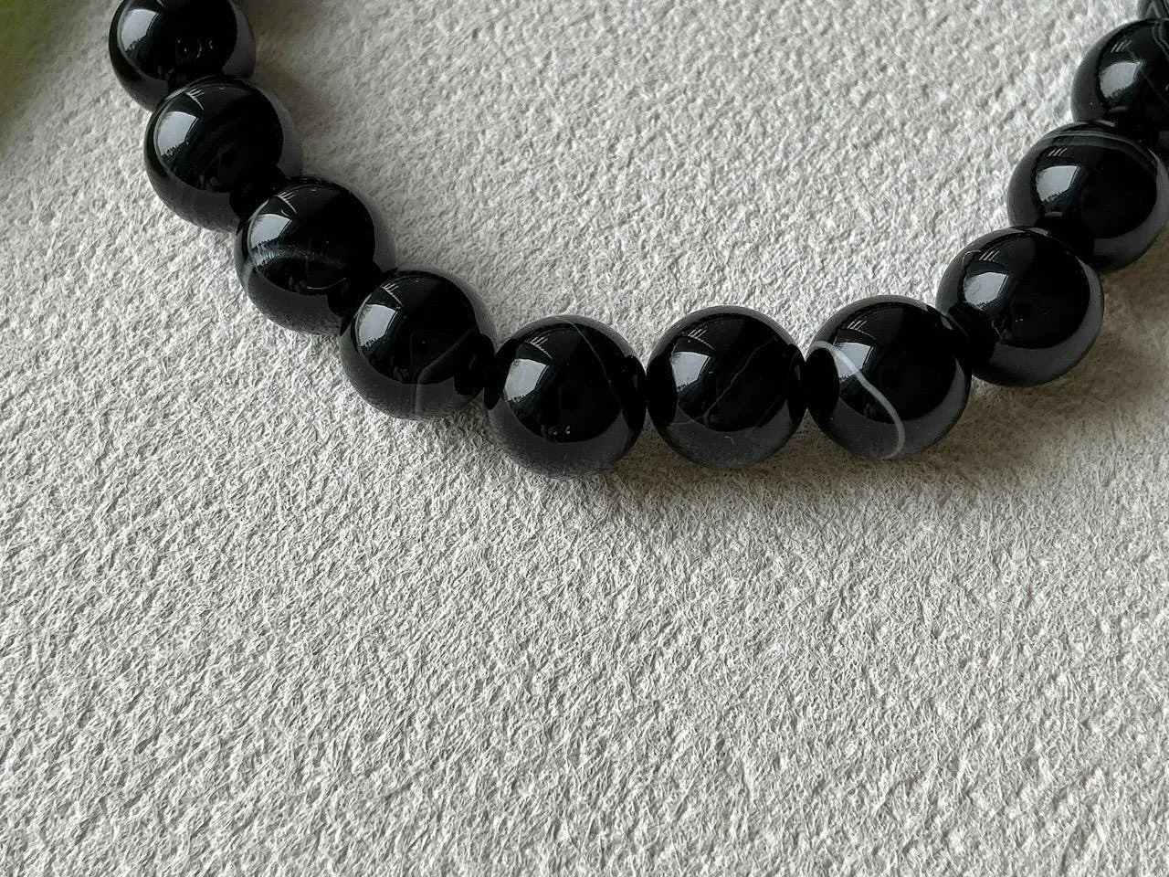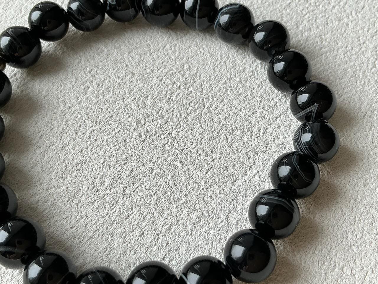 This handcrafted gemstone bracelet features banded black and white sardonyx beads, each one marked by natural layers formed over time, accented with a warm brass detail. Grounded and quietly striking, it carries a sense of strength shaped through experience.