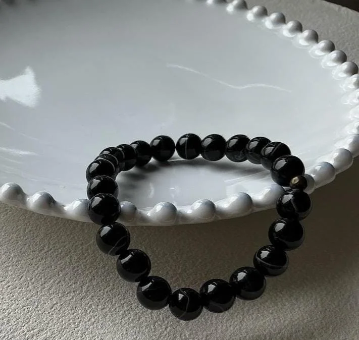 Black White Sardonyx Beaded Bracelet – 8mm Gemstone, Brass Accent, Meditation Strength