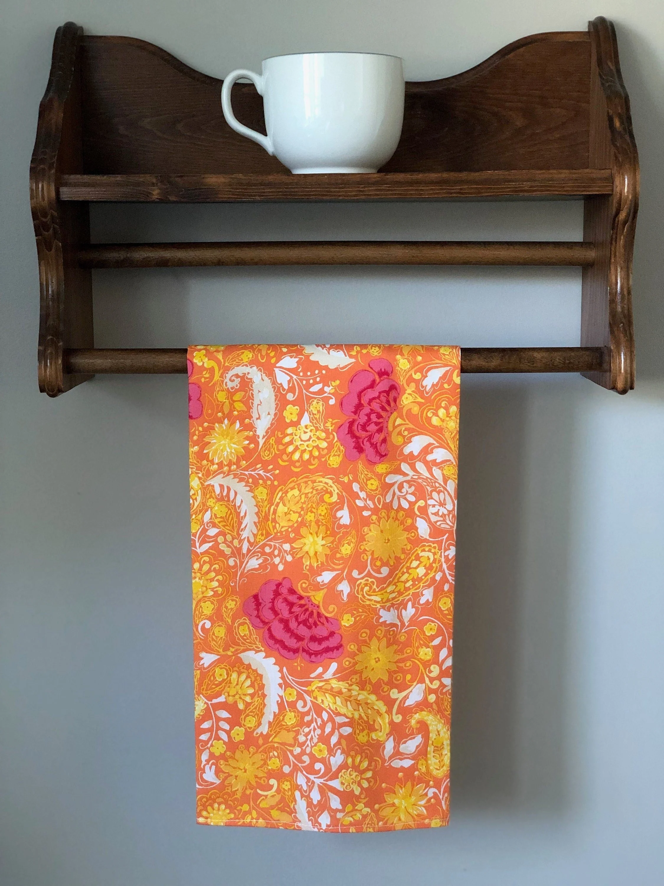 Premium cotton tea towel to brighten up your kitchen. Gorgeous, vivid orange color with beautiful pink blossoms. Dimensions are 29" x 20.5" Easily washable, reusable.
