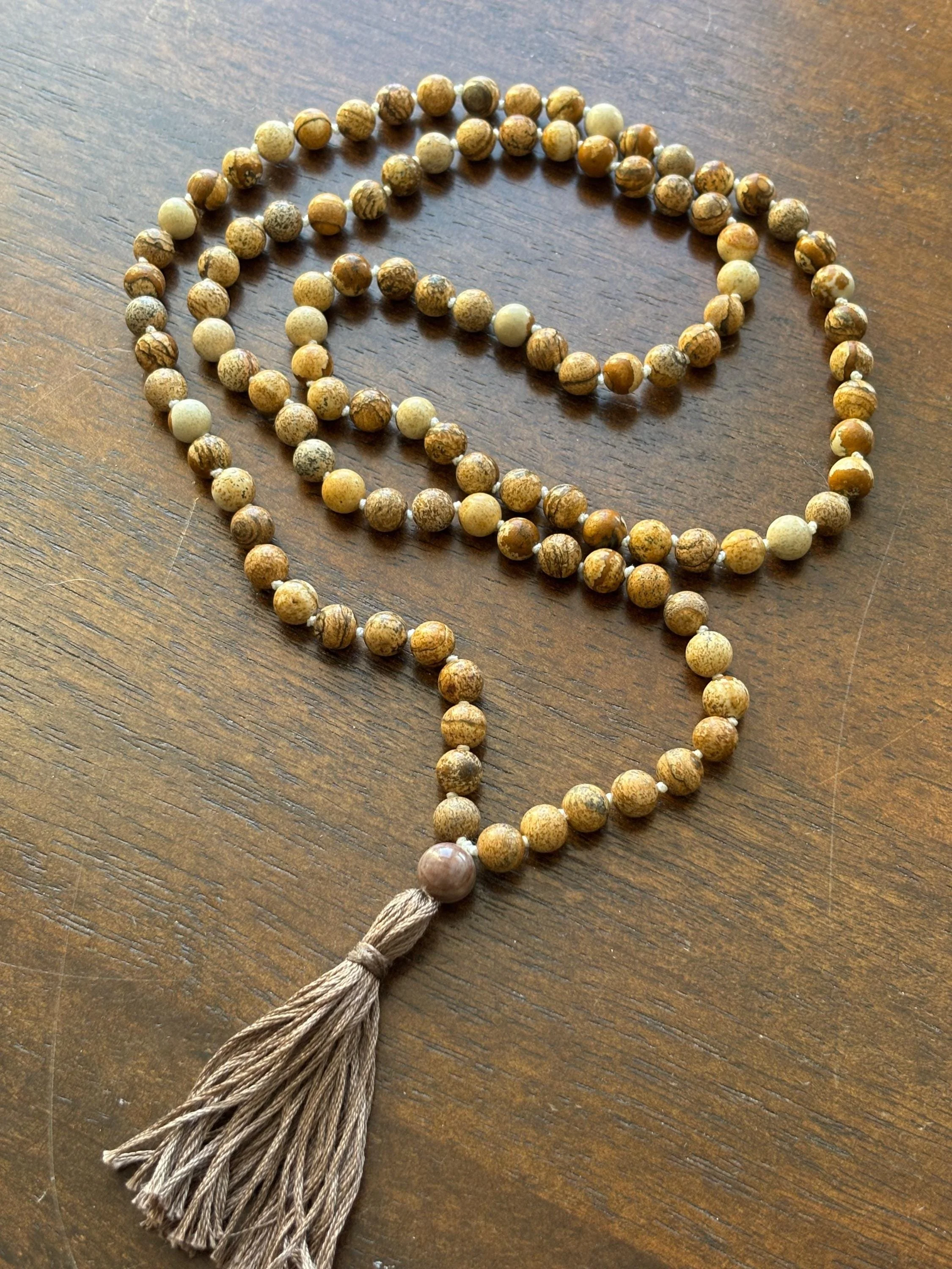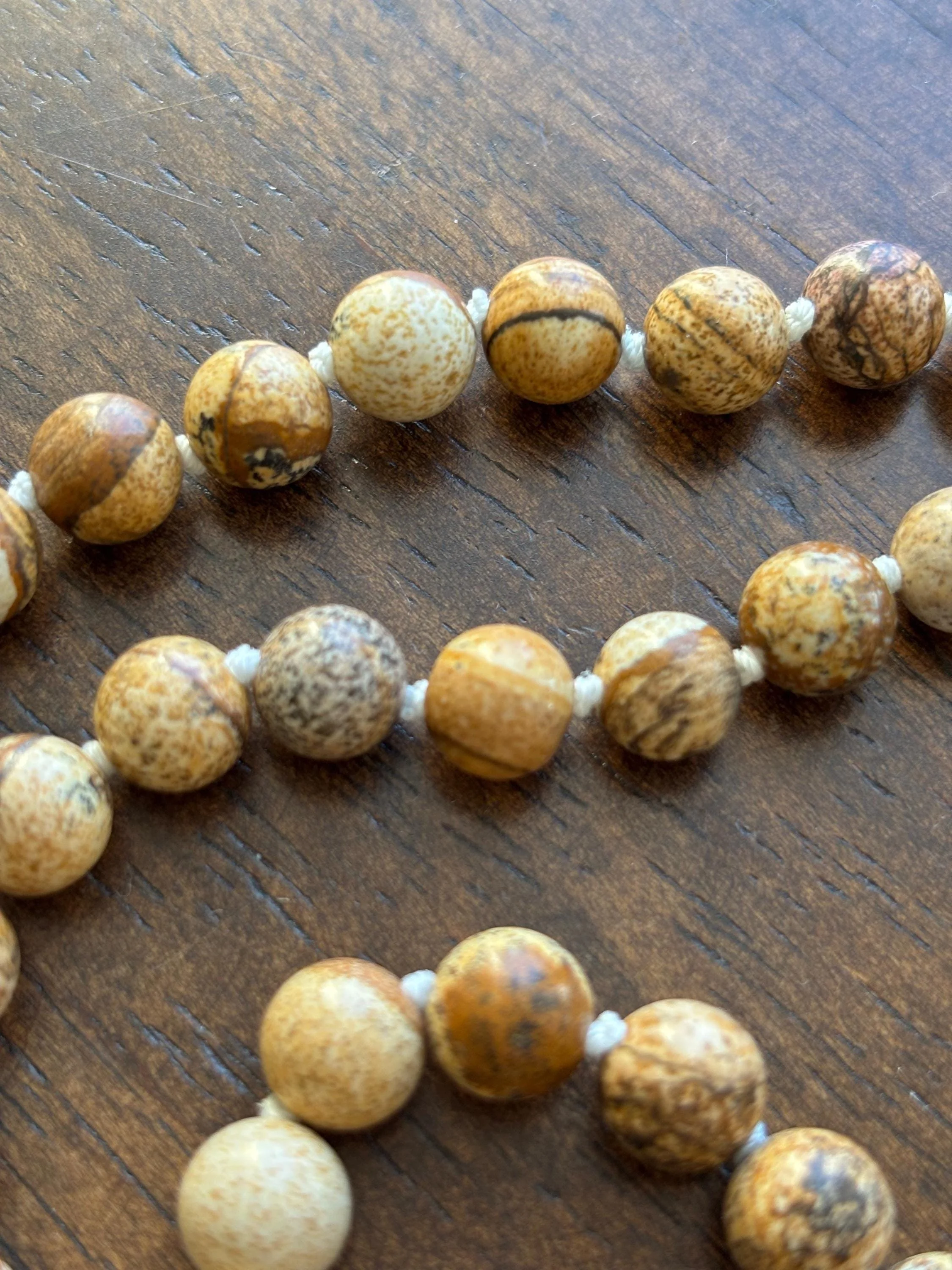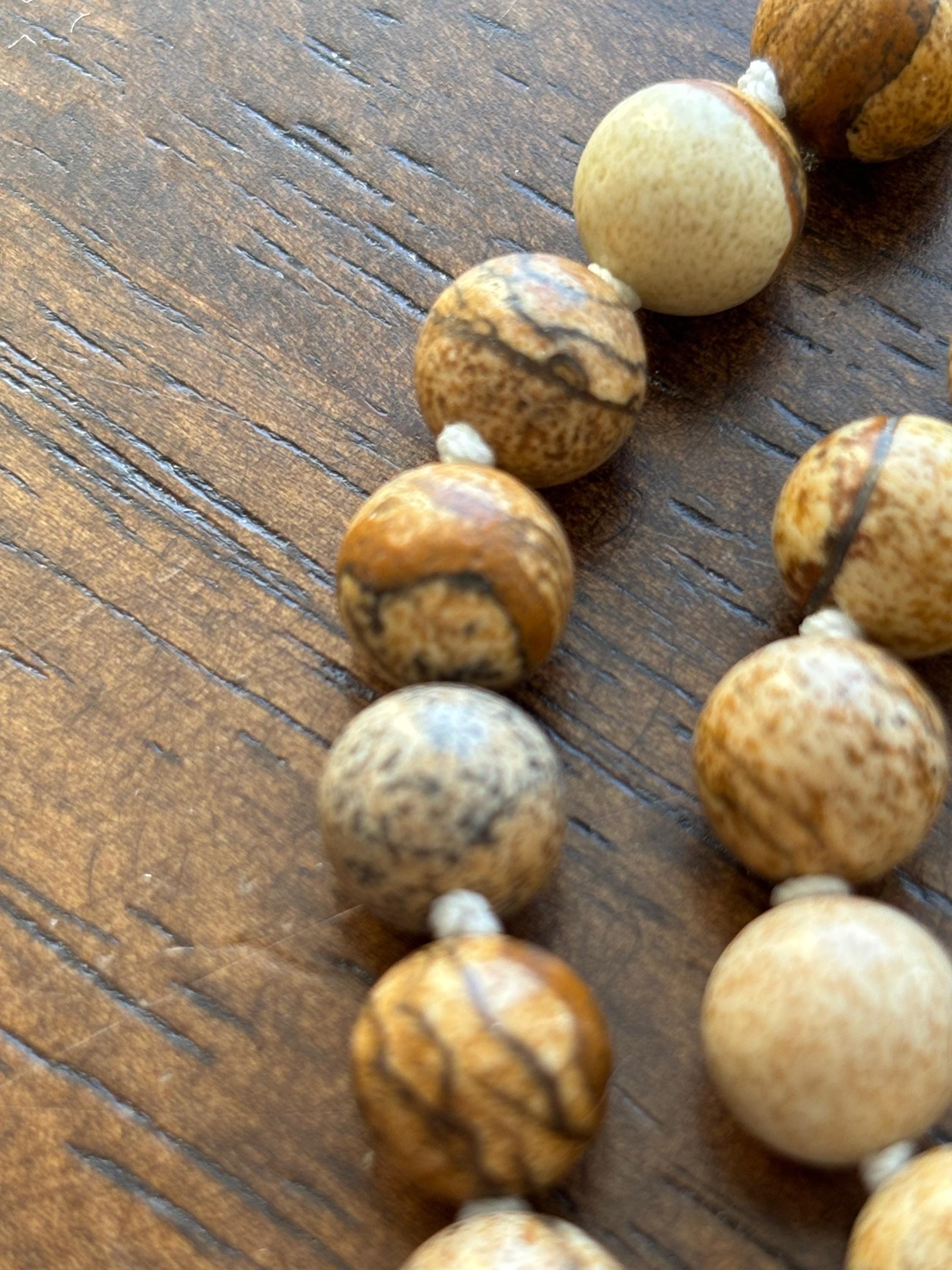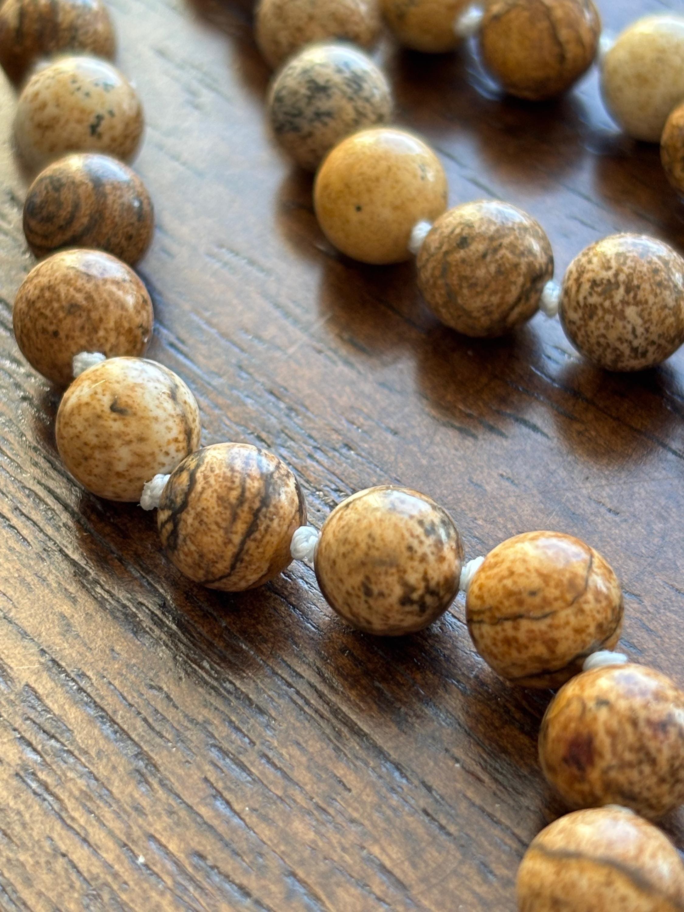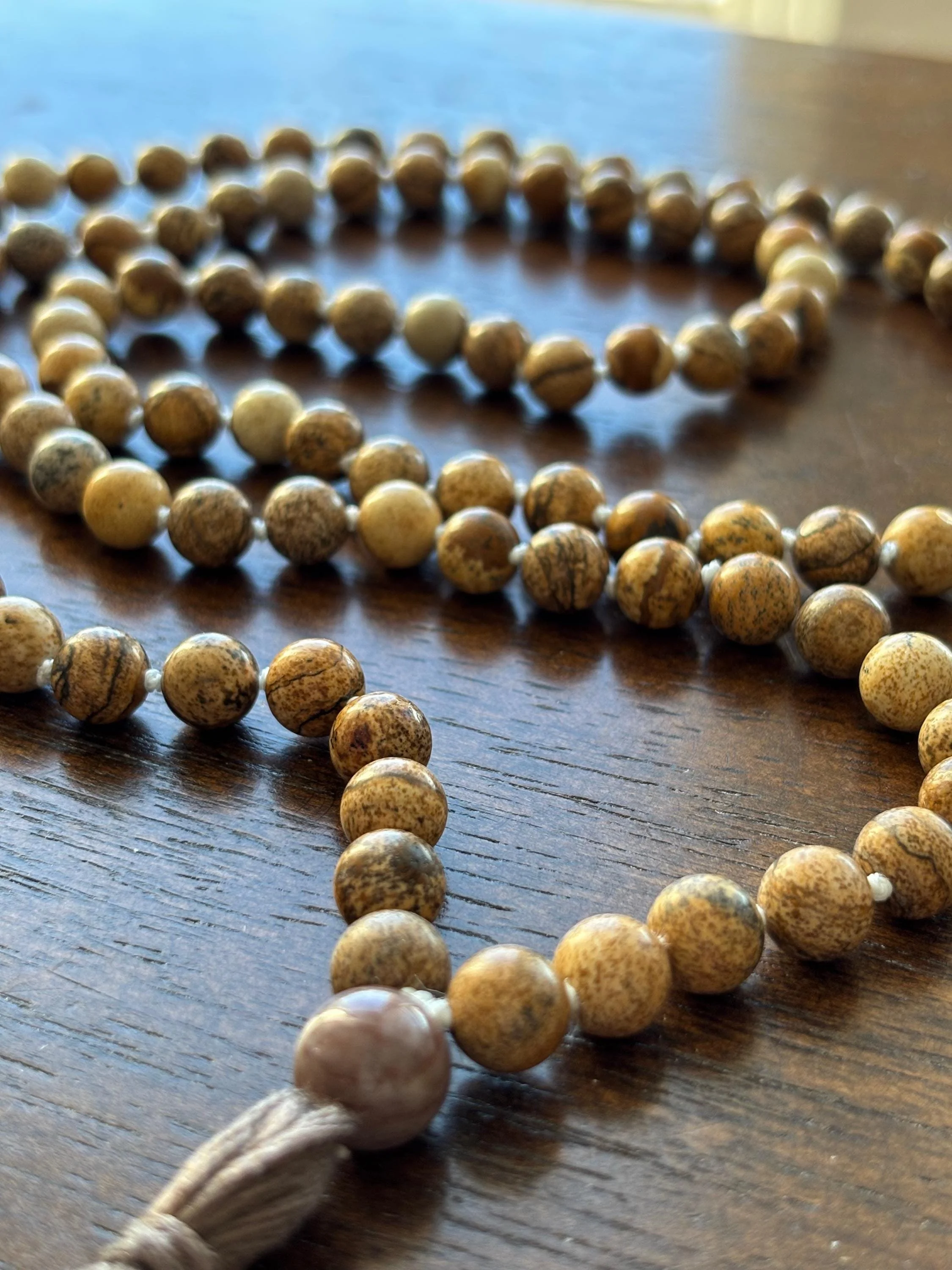 Picture Jasper Mala Necklace | 108 Bead, Petrified Wood Guru Bead